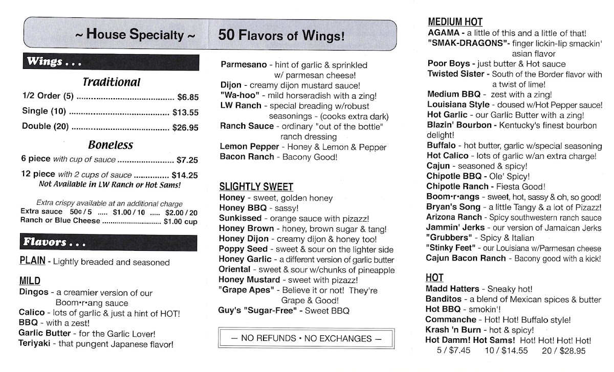 The menu at Little Wing Cafe offers a straightforward, casual dining experience centered around hearty, comforting bites. Perfect for gatherings with friends or a relaxed evening out, the selections highlight generous portions of chicken wings in a variety of distinctive flavors, alongside classic sides that pair well with cold drinks.